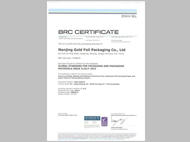 金箔包装获得食品brc认证a级证书